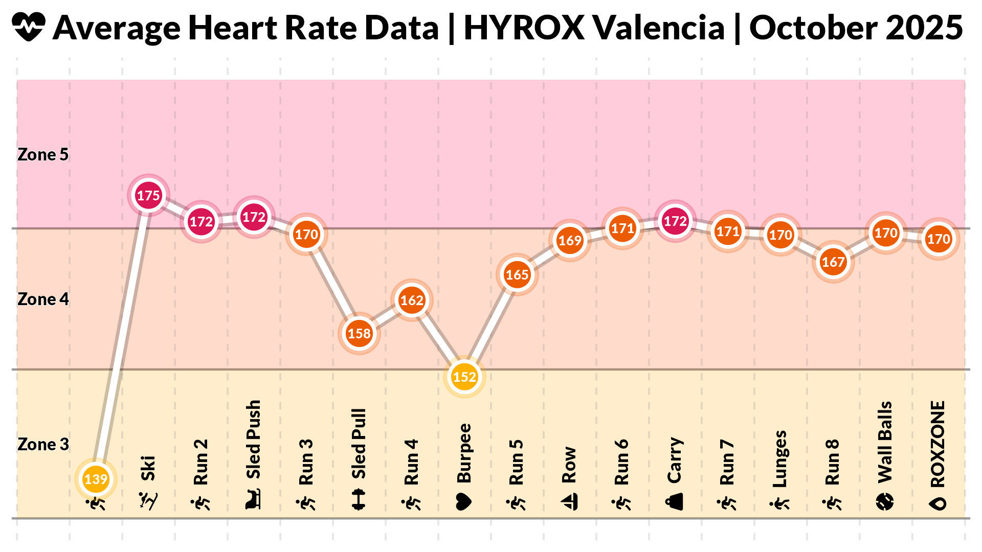 The bottom half of the visualisation traced my heart rate throughout the race, capturing the ebb and flow of effort across running segments and workout stations. The rising and falling bands of orange and red felt like a heartbeat for the race itself—a pulse that mirrored moments of endurance, bursts of strain, and brief windows of recovery.
